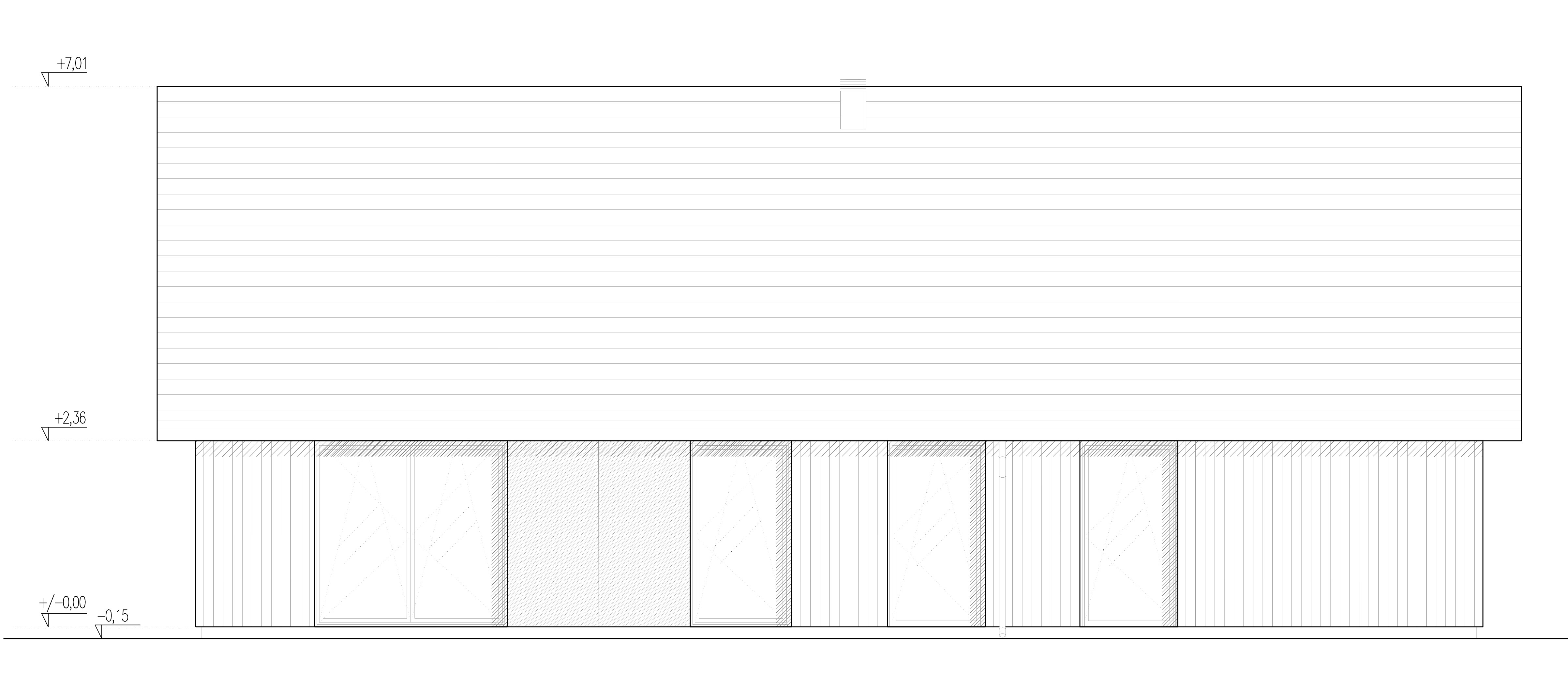 Le bâtiment présente une forme simple et calme avec des façades plates et harmonieuses. Les façades courtes sont identiques, avec des fenêtres placées sur l'axe de symétrie. Pour éclairer naturellement le grenier inutilisé d'un côté et le salon avec la salle à manger de l'autre, des oculi de 120 cm de diamètre ont été intégrés dans les pignons. Les côtés courts du bâtiment ne prolongent pas la ligne des avant-toits, leur donnant une apparence élancée malgré leur faible hauteur. Les façades longues, avec leurs proportions horizontales allongées, sont divisées par des fenêtres françaises verticales pour réduire l'impression de longueur excessive. Les zones clés des façades, telles que la zone d'entrée à l'avant et le salon à l'arrière, sont mises en valeur par un changement de finition.
